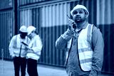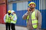worker or engineer using walkie talkie and talking about work in containers warehouse storage