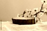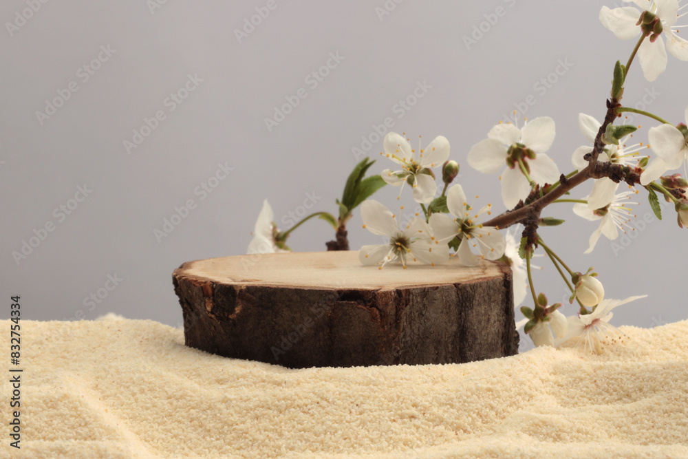 Wooden stump circle platform podium on beige sand background. Minimal empty display product presentation scene.
