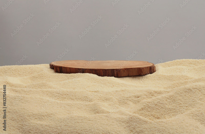Wooden stump circle platform podium on beige sand background. Minimal empty display product presentation scene.