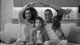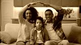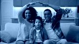 Smiling joyful African American ethnic family young happy homeowners mother father hands showing roof gesture little son boy child kid posing looking camera inside new home. Housing buying real estate