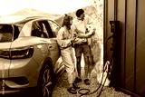 Portrait of a young couple with their cute white dog near house and modern electric car outdoors. Concept of family and wellbeing