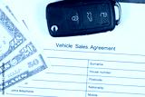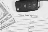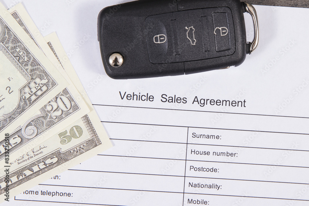 Car key, dollar banknotes and vehicle sales agreement. Sales, purchases of automobile. Transportation