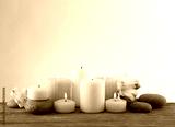 Beautiful composition with candles and spa stones on light background