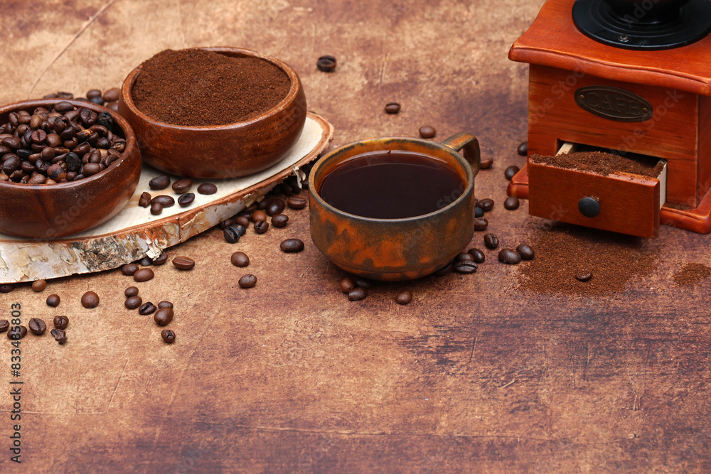 Filterkaffe und Kaffeebohnen auf Holzhintergrund mit Platz für Text.