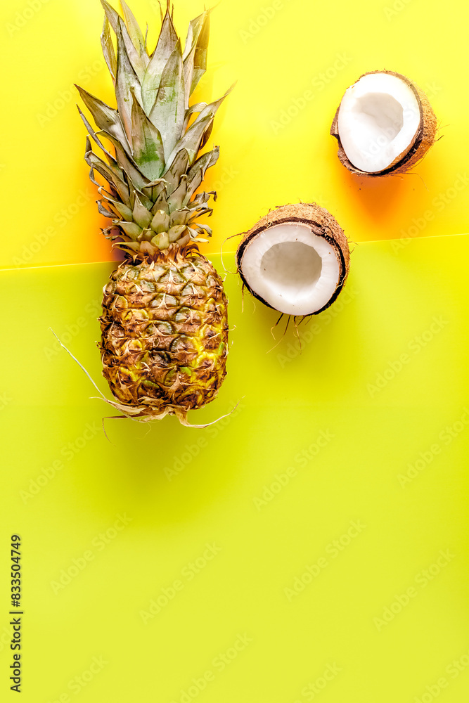 summer dessert with pineapples and coconut on yellow background top view mock up