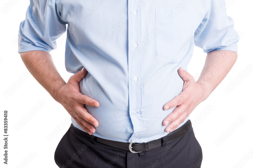 Hands grabbing bloated abdomen
