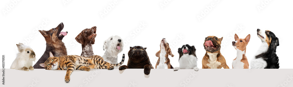 Collage. Purebred cat, dogs and carrot isolated on white background. Adorable domestic pets. Concept of animal, pet care, veterinary. Copy space for ad
