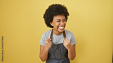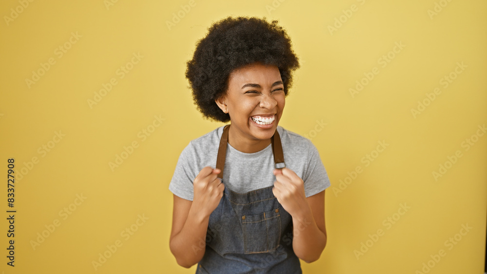 Cheerful african american woman with curly hair wearing an apron smiles against a yellow wall.