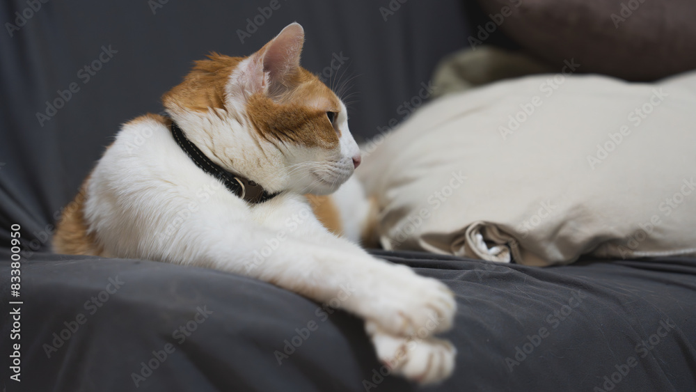 Close up of cat relaxing at home, concept of portrait fluffy indoor cat, adorable and cute pet kitten, animal therapy, relationship friendship and bonding, pet's nose and mouth, orange and tiger
