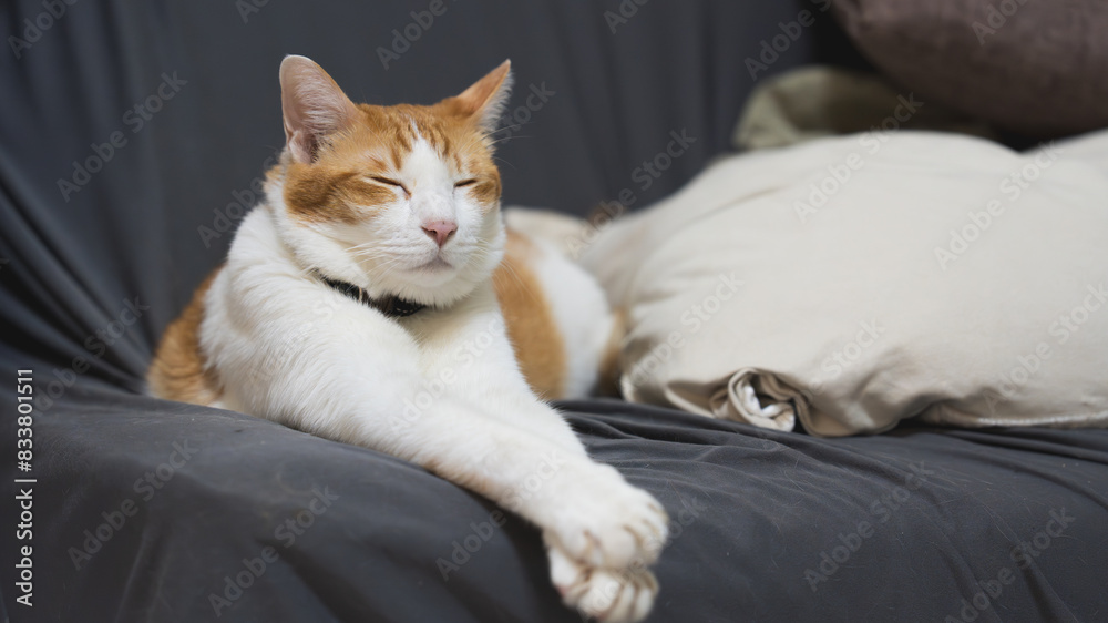 Close up of cat relaxing at home, concept of portrait fluffy indoor cat, adorable and cute pet kitten, animal therapy, relationship friendship and bonding, pet's nose and mouth, orange and tiger
