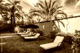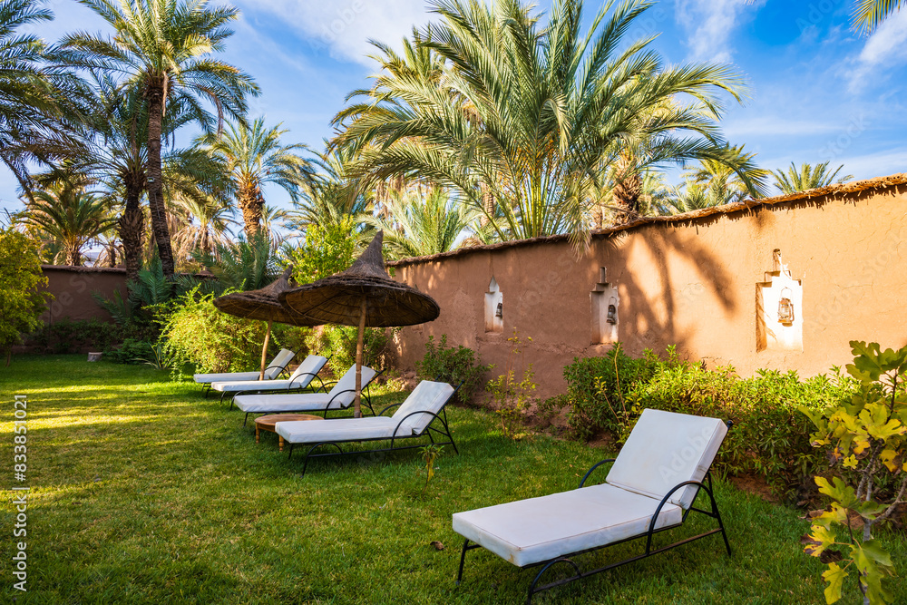 Sunchairs in luxury lodge hotel tropical garden near Agdz town in Atlas Mountains, Morocco, North Africa