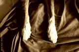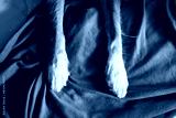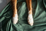 Two furry dog paws rest gently on a textured green blanket, evoking a sense of relaxation
