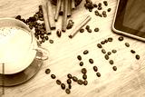 tablet, wi-fi world composed of coffee beans, cup of coffee