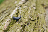 weiblicher, sehr giftiger Schwarzblauer Ölkäfer, Meloe proscarabaeus, auf einem am Boden liegenden Baumstamm