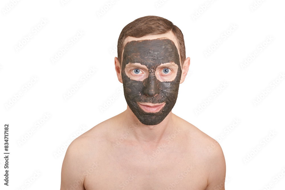 Black Clay Mask on Guy Face. Cosmetology man portrait with mud healthy scrub. Coal nature eco masque. Dermatology charcoal product. Home skin care routine. Skincare male treatment. White background
