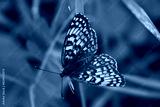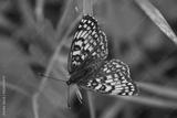 Close-up of orange, white and brown False-heath Fritillary butterfly on a green plant. Melitaea diamina