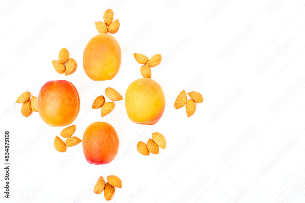 Taste of summer.Fresh ripe apricot fruits, kernels isolated on white