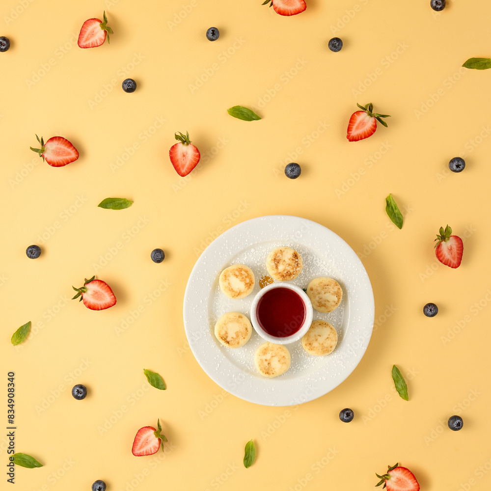 Delicious Syrniki with Berry Jam on Yellow Background - Flat Lay Food Photography