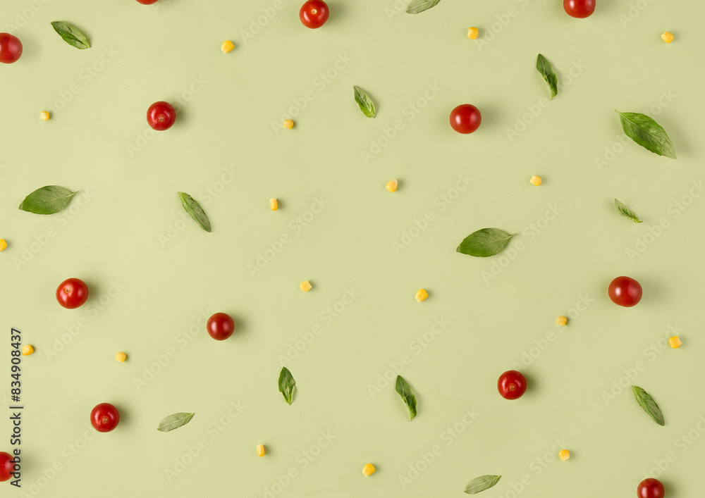 Fresh Vegetables and Greens Flat Lay on Light Green Background - Top View of Cherry Tomatoes, Basil Leaves, and Corn