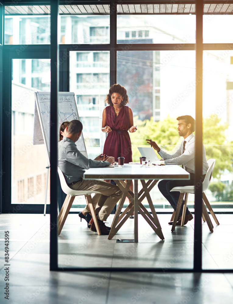 Meeting, leadership and business woman in office with whiteboard presentation for data analytics, training and review. Teamwork, coaching and girl speaker with group for workshop, ideas or feedback