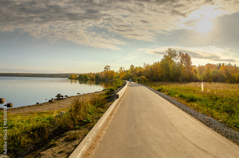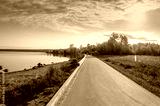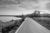 An asphalt road along the lake shore .