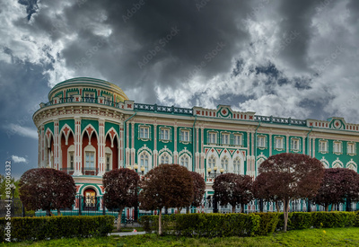 Ekaterinburg.The old 19th century building of Sevastyanov's House in the spring among the blooming apple trees.
