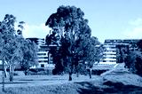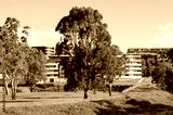 Modern and contemporary-style residential apartment buildings overlook a park with large open space, walking trails, and grass lawns in the suburb of Maribyrnong, Melbourne, VIC Australia.