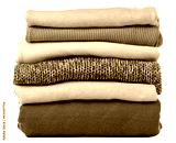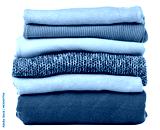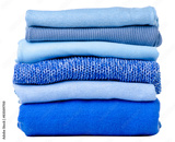 Stack folded blue sweaters on white background isolation