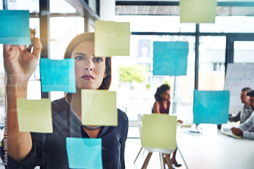 Thinking, writing and business woman planning presentation in office for schedule, goal or team calendar. Agenda, idea or sticky note with creative, vision or research results for storyboard mind map