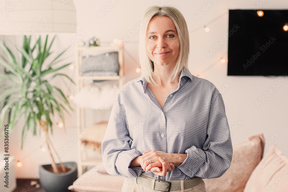Portrait of Happy Middle Aged Woman standing in living room