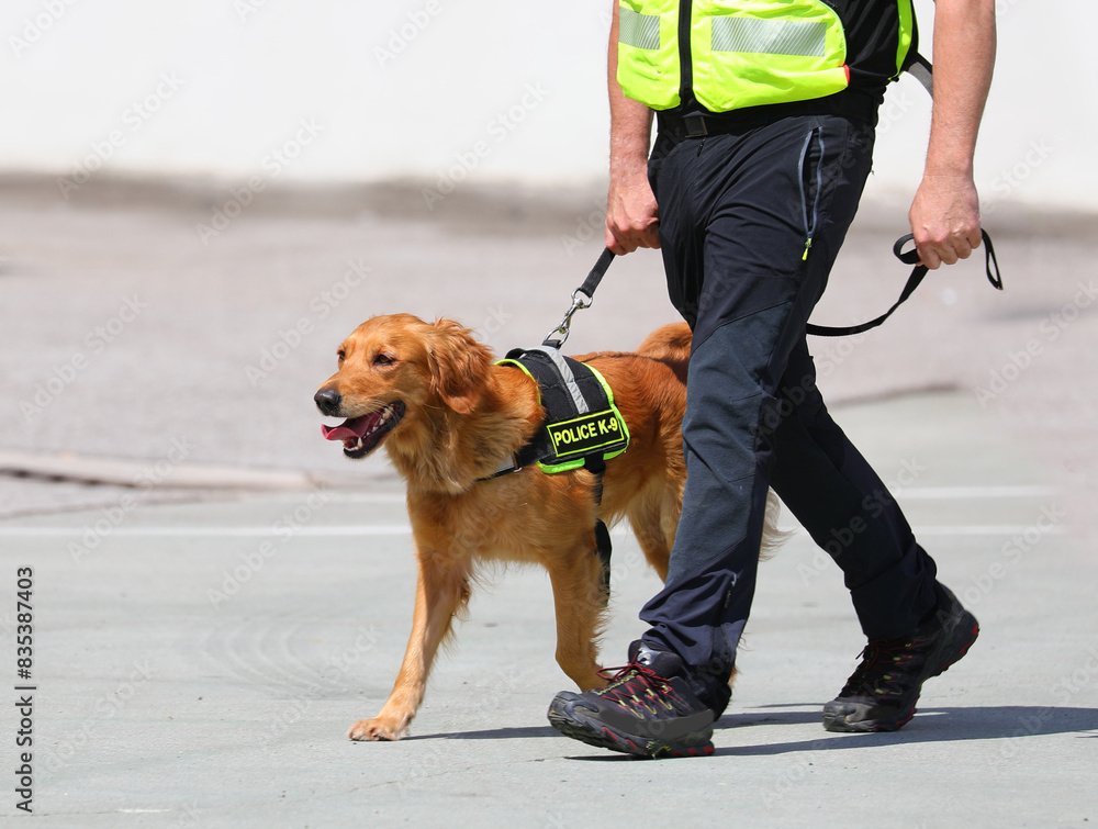 Police dog with leash during a police operation to combat drug trafficking in the port