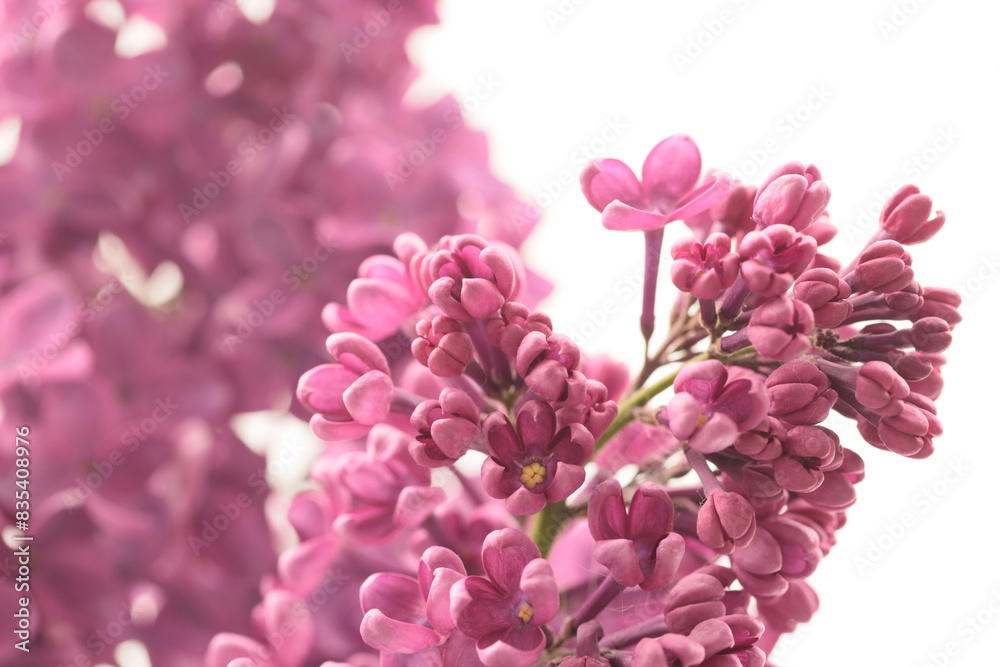 Purple pink Lilac flower branch bouquet on white. Selective soft focus. Nature background.