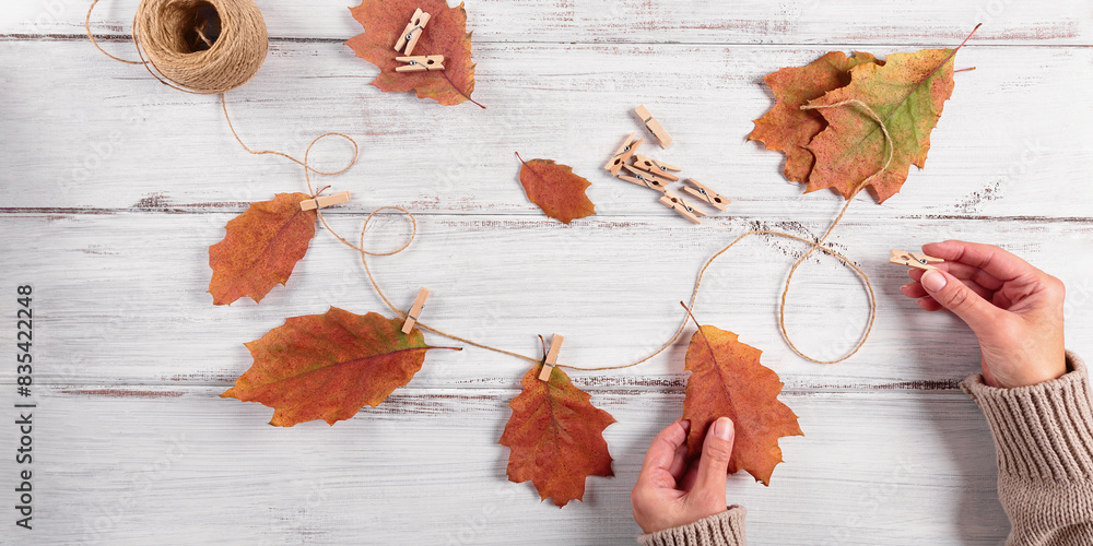 Homemade garland of autumn leaves. Womans hand hanging leaves on rope with clothespin on white wooden background. Home diy decor for celebrating fall holidays, Thanksgiving and Halloween banner