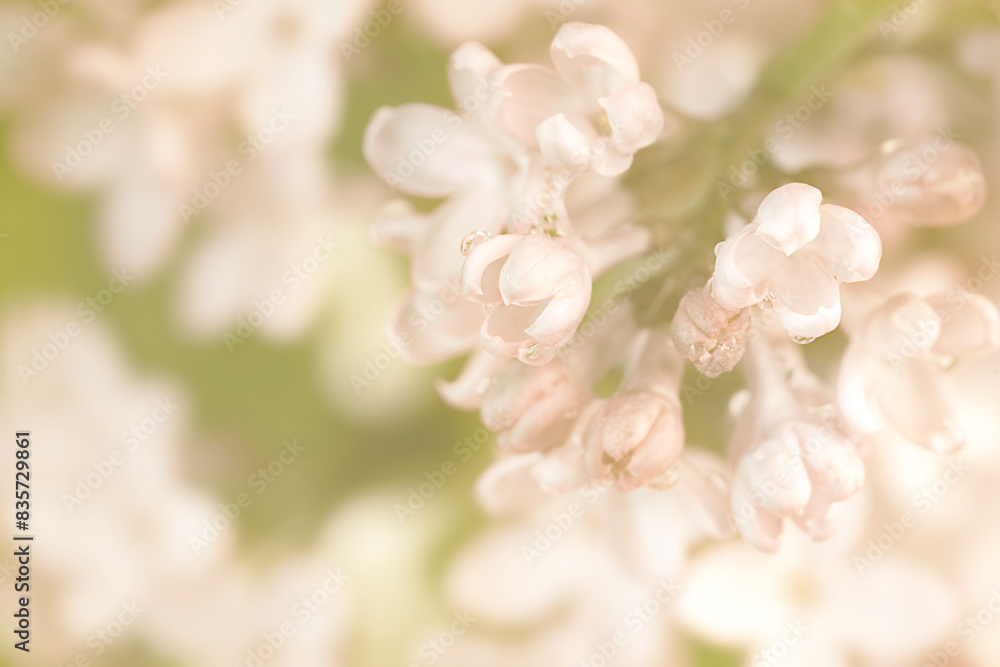 Pale pink lilac blooming fresh flowers in the corner with blur natural background macro