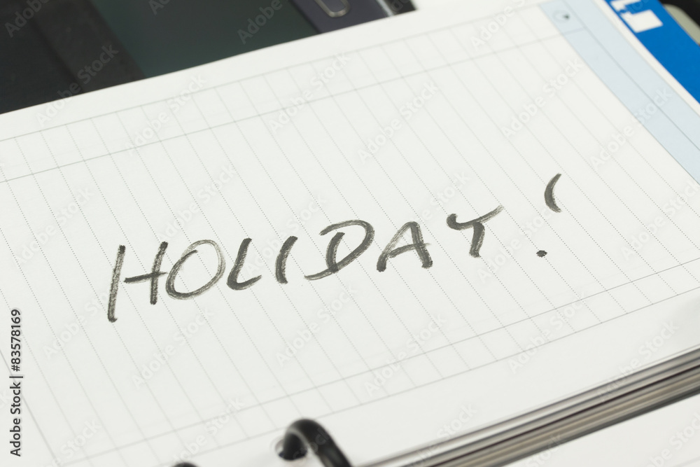 Open page of paper managers diary with an inscription HOLIDAY