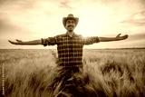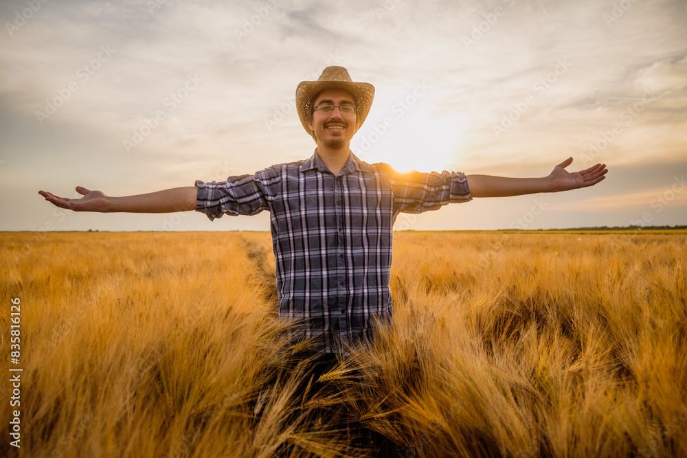 Happy farmer standing in his wheat field. He is satisfied with crops.