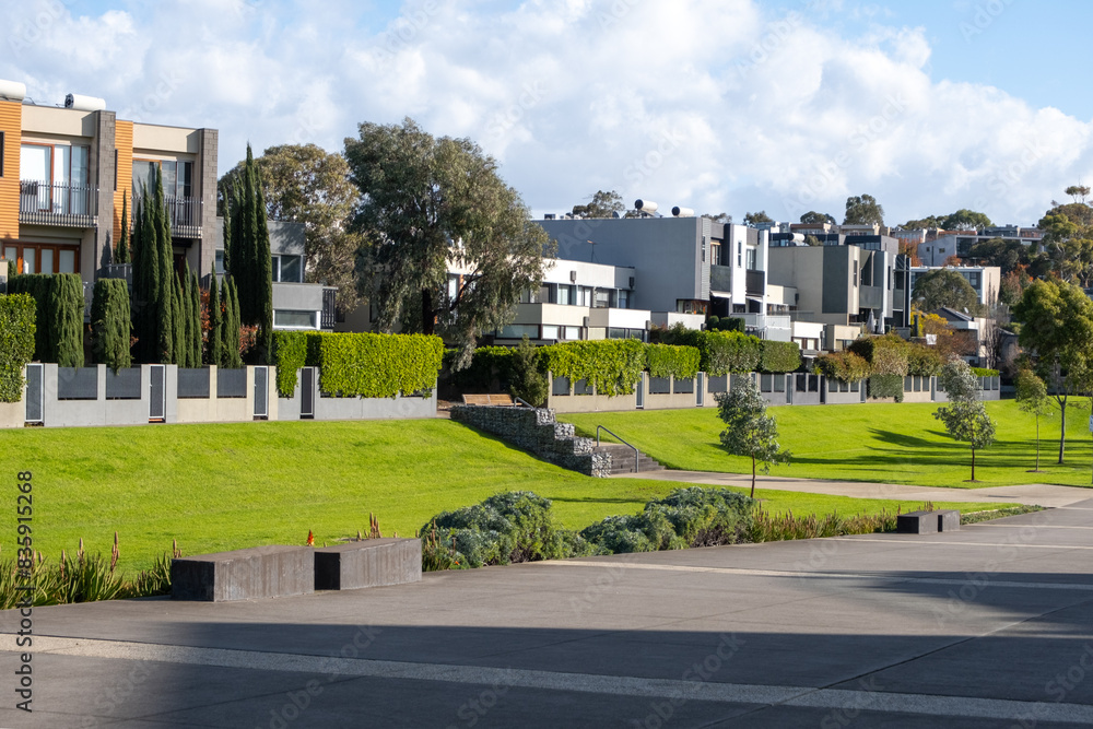 A row of modern and contemporary-style houses facing a large urban park with a concrete walkway and landscaped grass lawn. Suburban homes in the suburb of Maribyrnong, Melbourne, VIC, Australia.