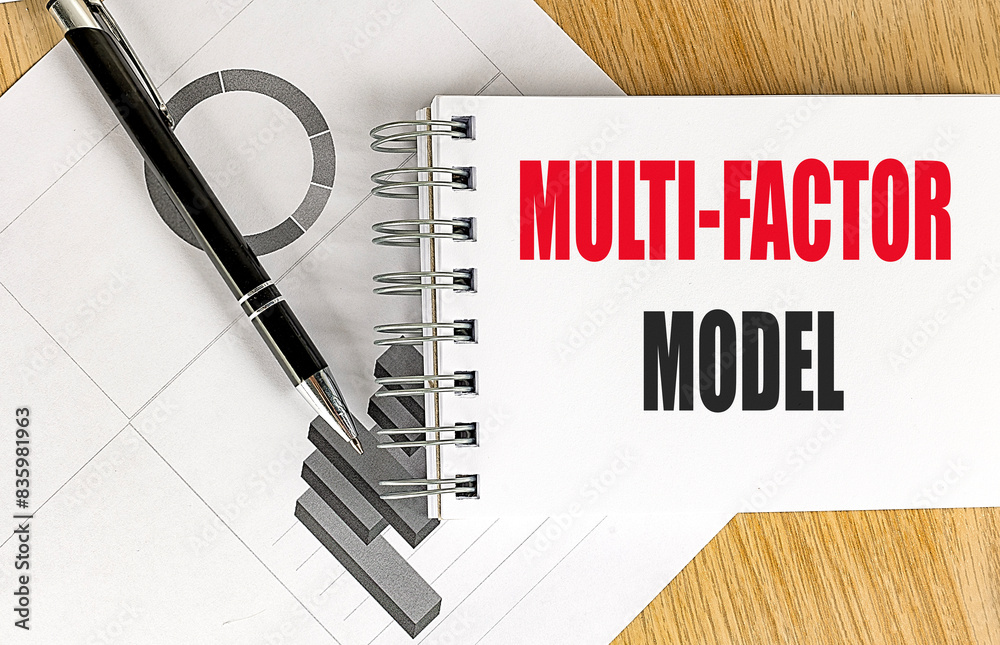 MULTI-FACTOR MODEL text on notebook with chart on wooden background