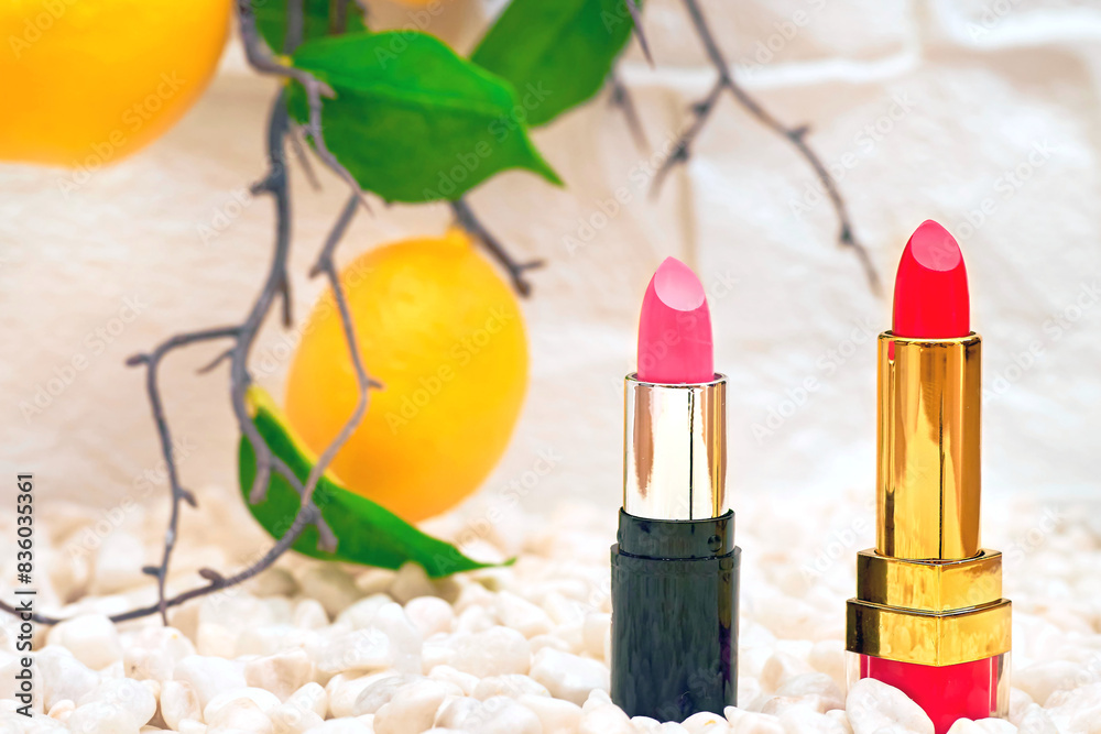 Two red pink lipsticks on yellow pebbles stones with lemon branch