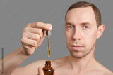 Man skin care routine. Oil pipette near male face. Hair serum product. Haircare facial beard treatment. Applying healthy cosmetics. Beauty skincare hydration. Isolated on grey background