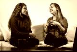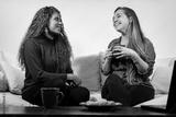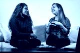 Par de amigas teniendo una charla de chicas en el living de su casa
