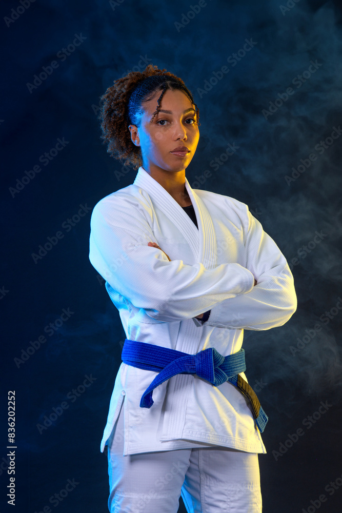 Brazilian girl Jujutsu fighter is ready for the Jiu Jitsu wrestling competition. Brazilian sport ju-jitsu. Mixed martial arts.