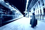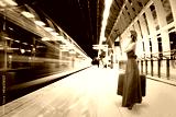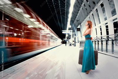 Elegant woman with a suitcase standing on a train departure platform