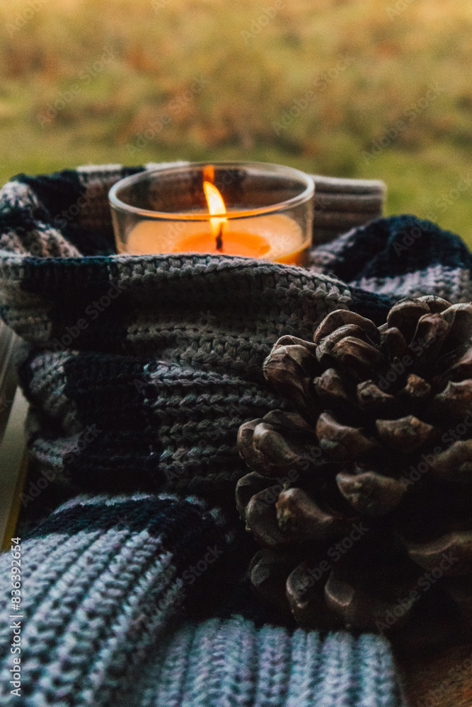 Orange scented wax candle in glass tumbler wrapped in a knitted scarf or sweater with a green natural background. Pine cone. Cozyness of slow living.