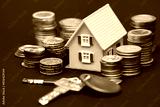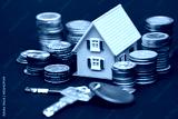 Model of a toy house surrounded by coins and apartment keys