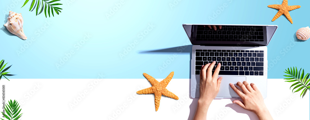 Person using a laptop computer with summer theme objects - flat lay