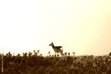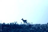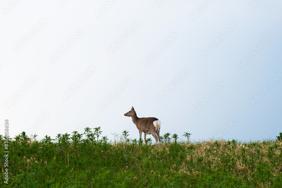 丘の上に立つ一頭のエゾシカ、知床フレペの滝遊歩道