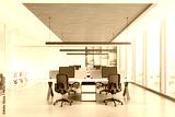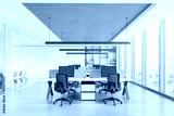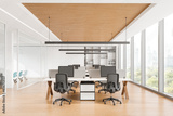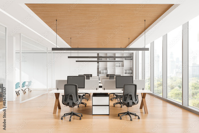 Modern office interior with workstations and computers, bright lighting, wood and white finish. Concept of workspace. 3D Rendering