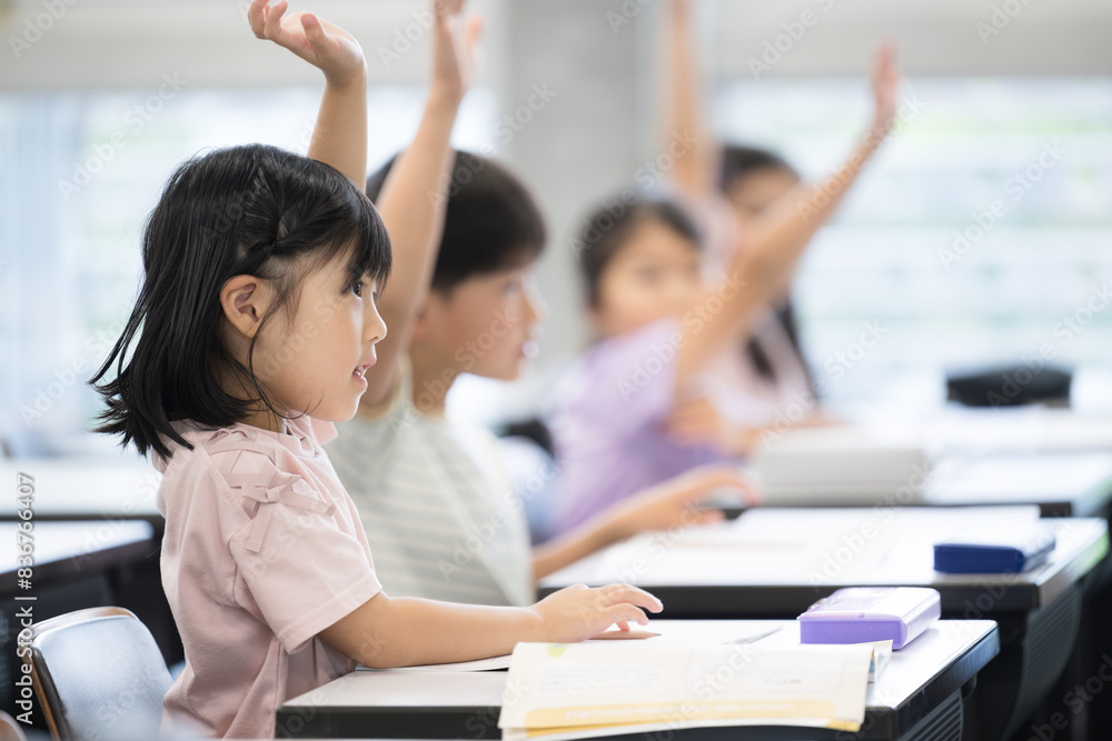 逆光の綺麗な明るい教室で授業をうけ勉強する元気な小学生 ハイと手を挙げ挙手をする