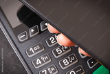 Mobile phone or smartphone with payment terminal. Credit card reader. Cashless paying for shopping. Finance concept